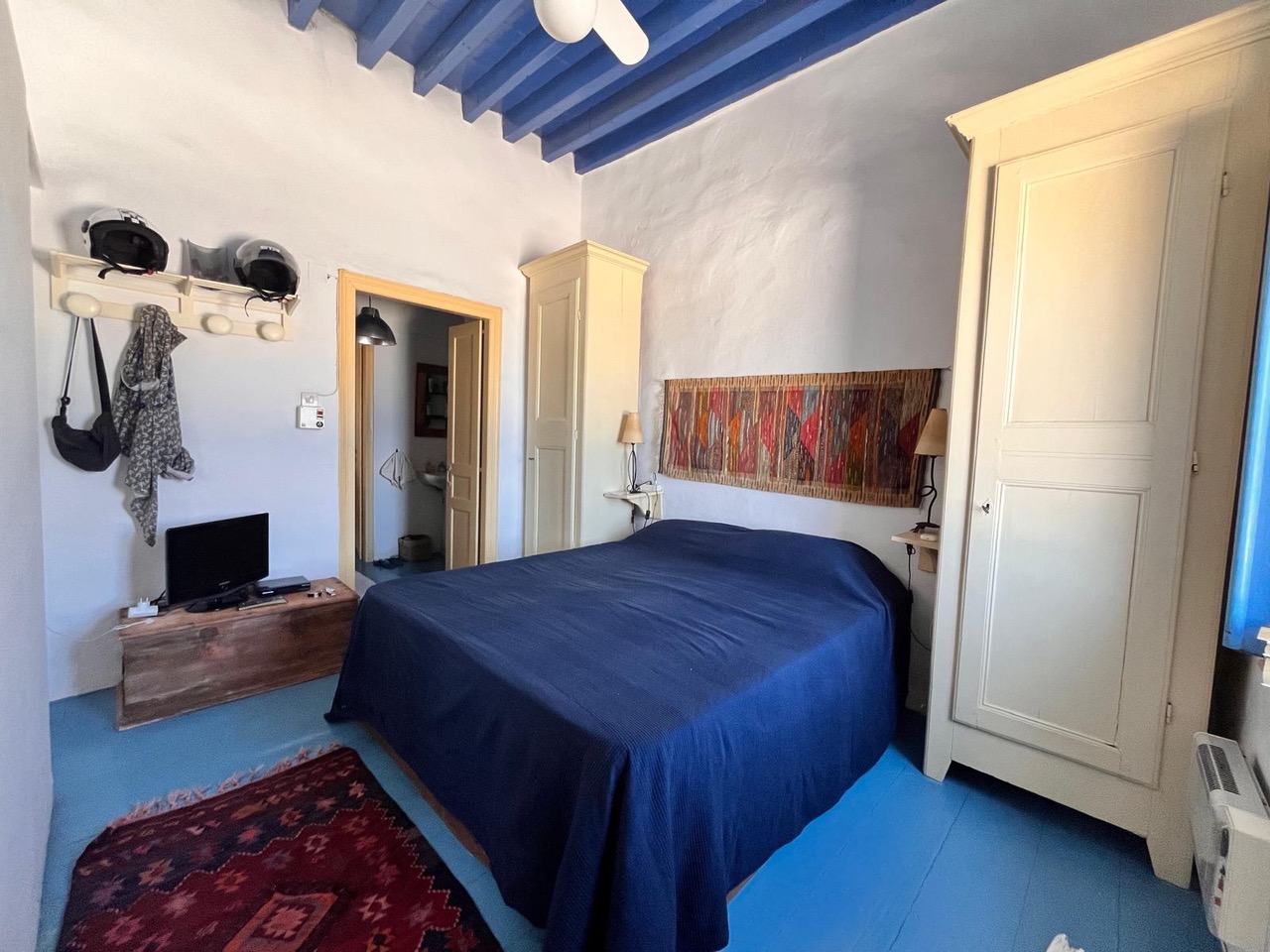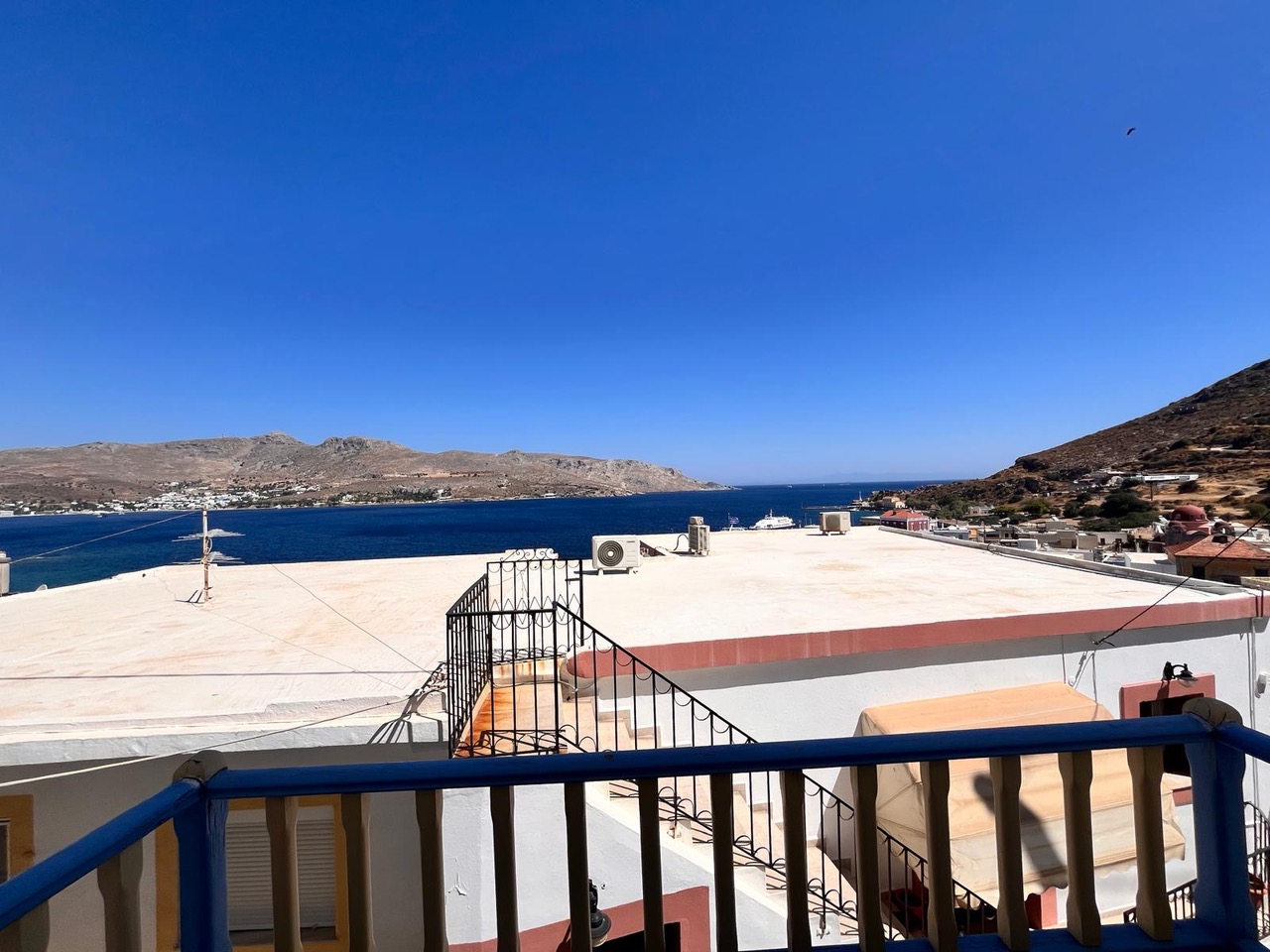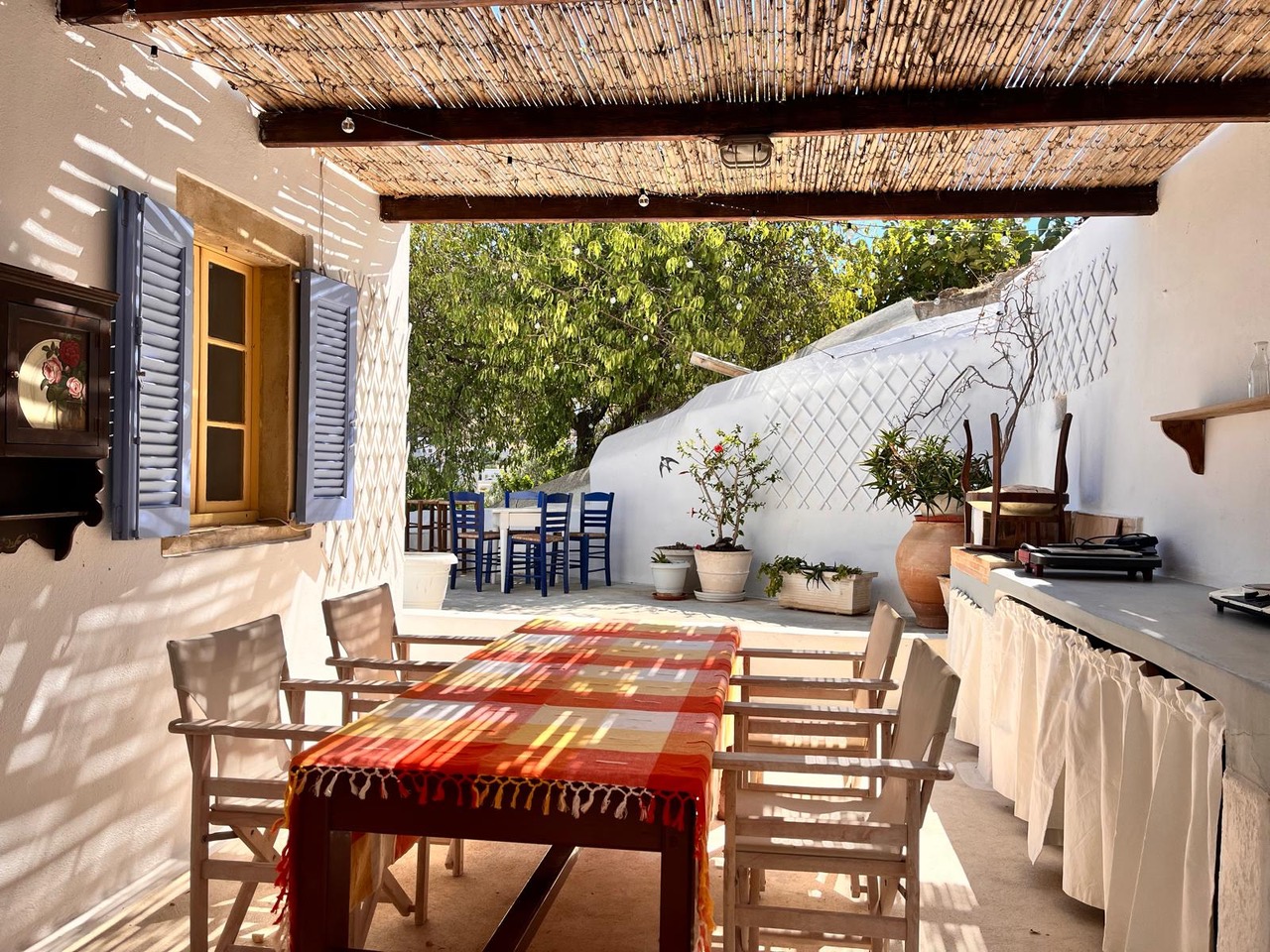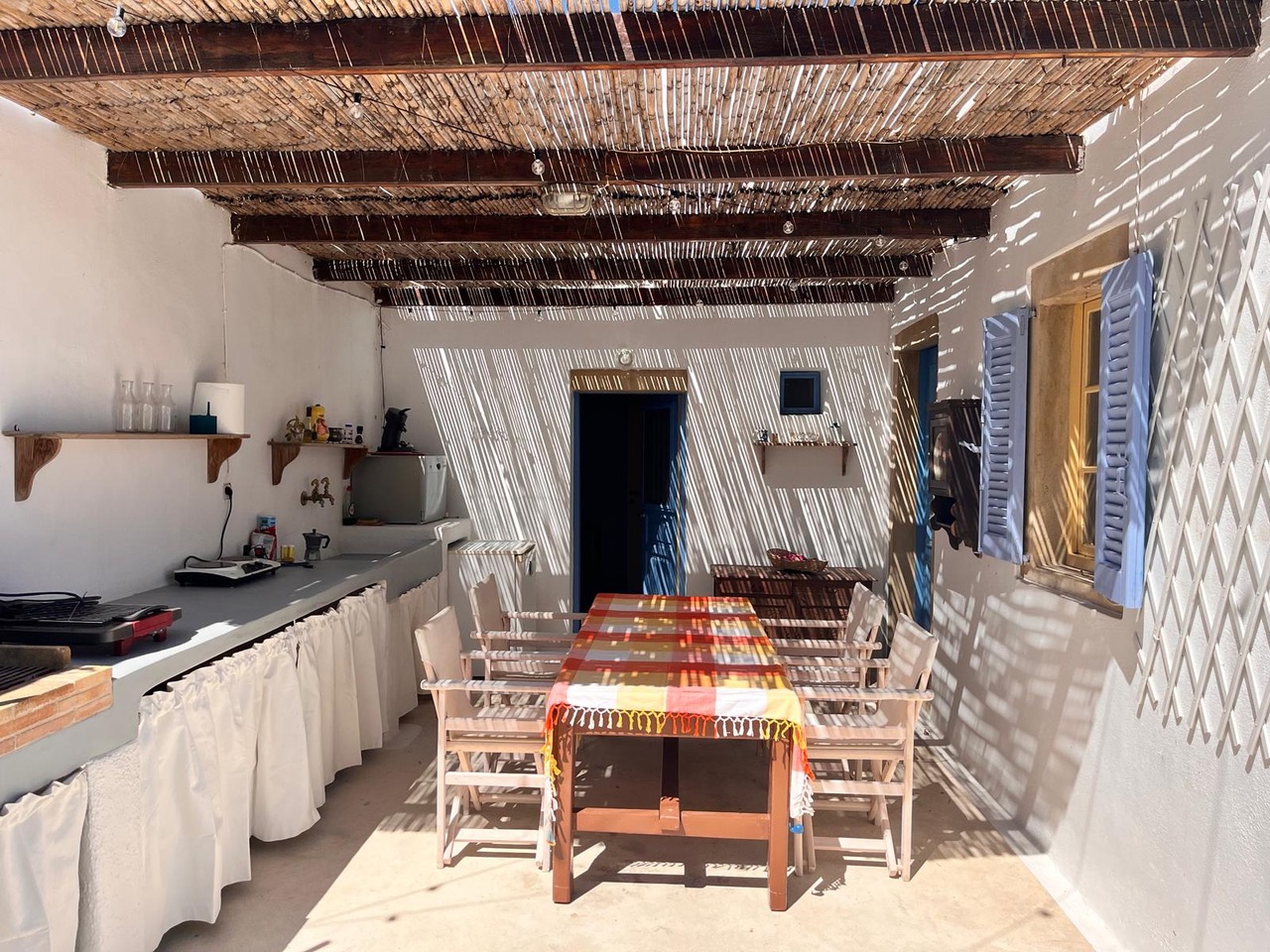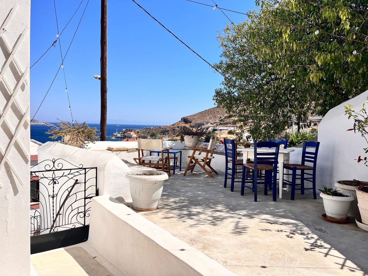 Traditional Greek house in Agia Marina sleeps up to 6 guests. Two independent bedrooms, one with a large double bed, another with a bunk bed and two single beds in the kitchen lounge area. A large private patio with BBQ has stunning views of Agia Marina, the castle and Turkey on the distance